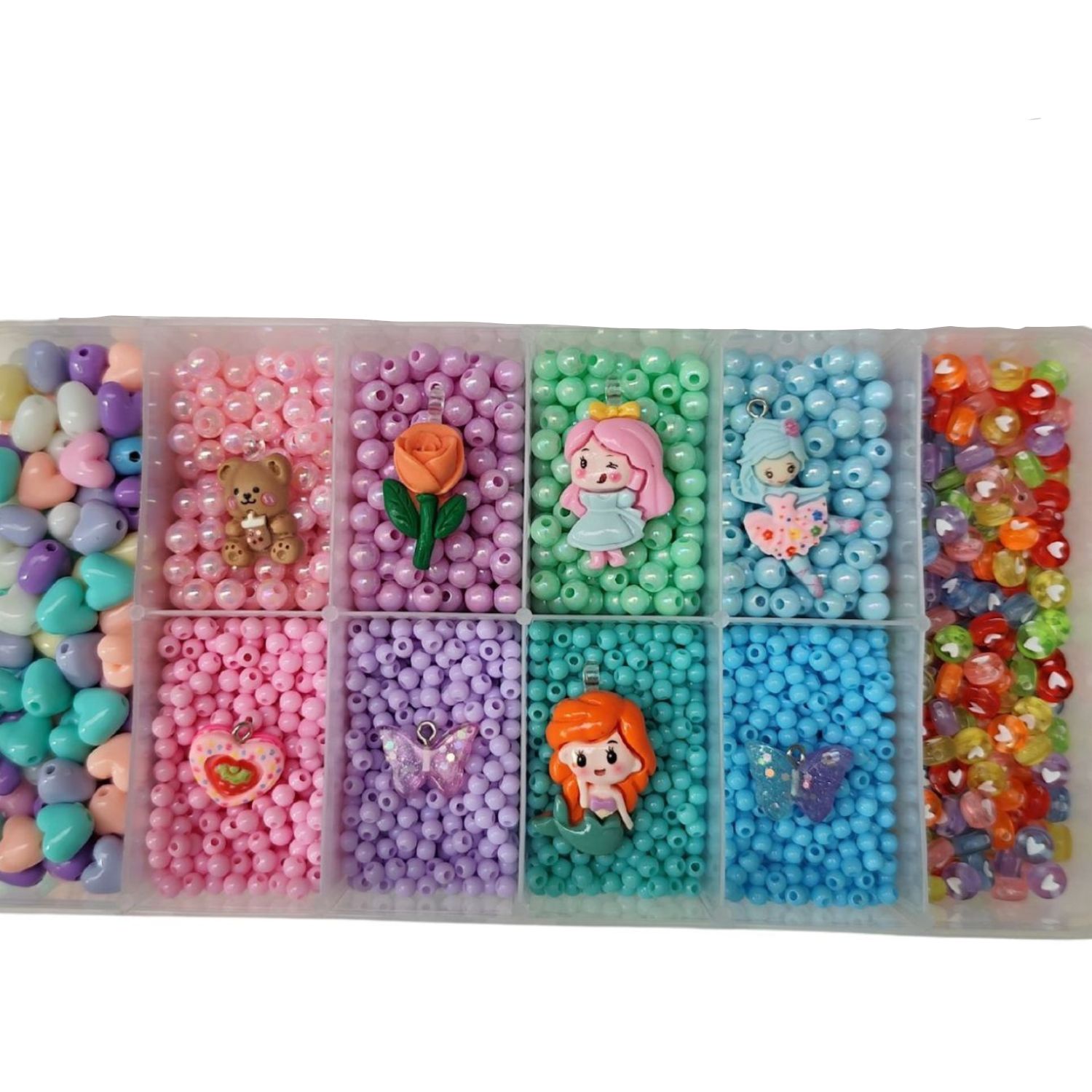 O kit vem com pérolas variadas, entremeios, pingentes, além de fio de silicone e uma caixa organizadora prática para manter tudo separado e fácil de usar.