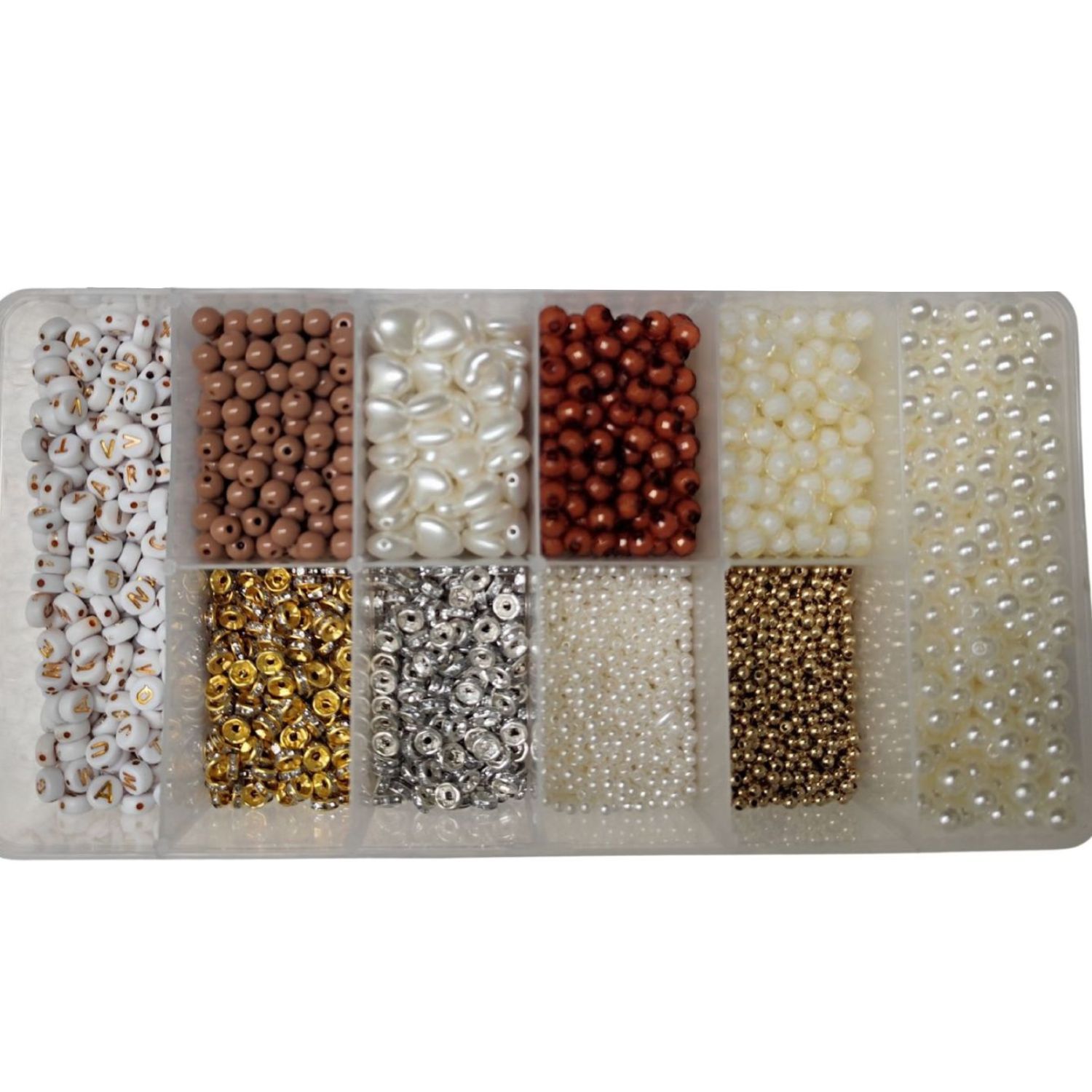 O kit vem com pérolas variadas, entremeios, além de fio de silicone e uma caixa organizadora prática para manter tudo separado e fácil de usar.